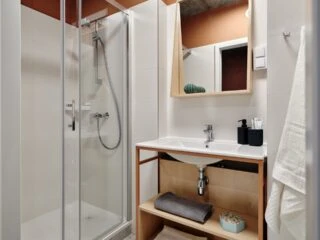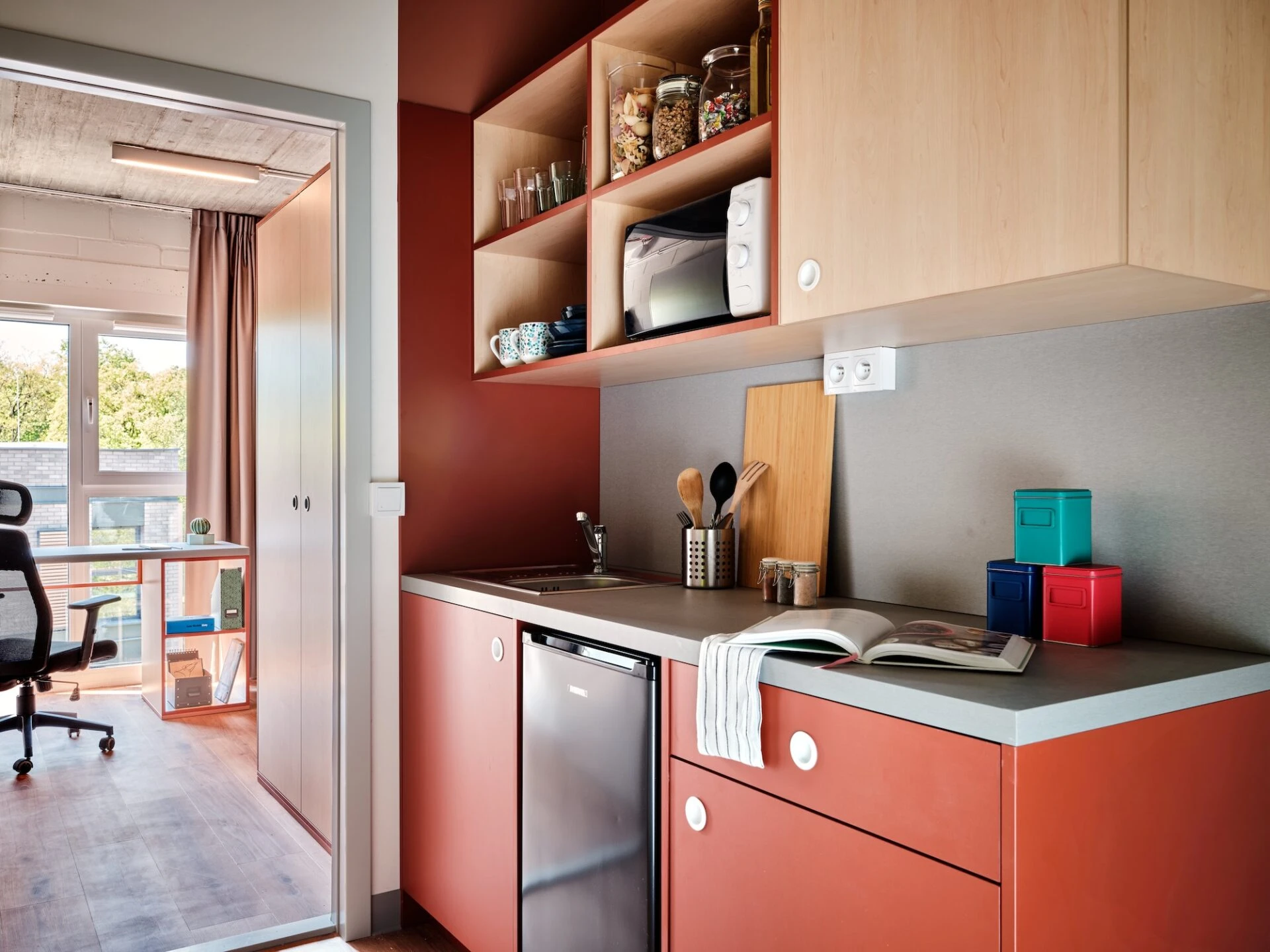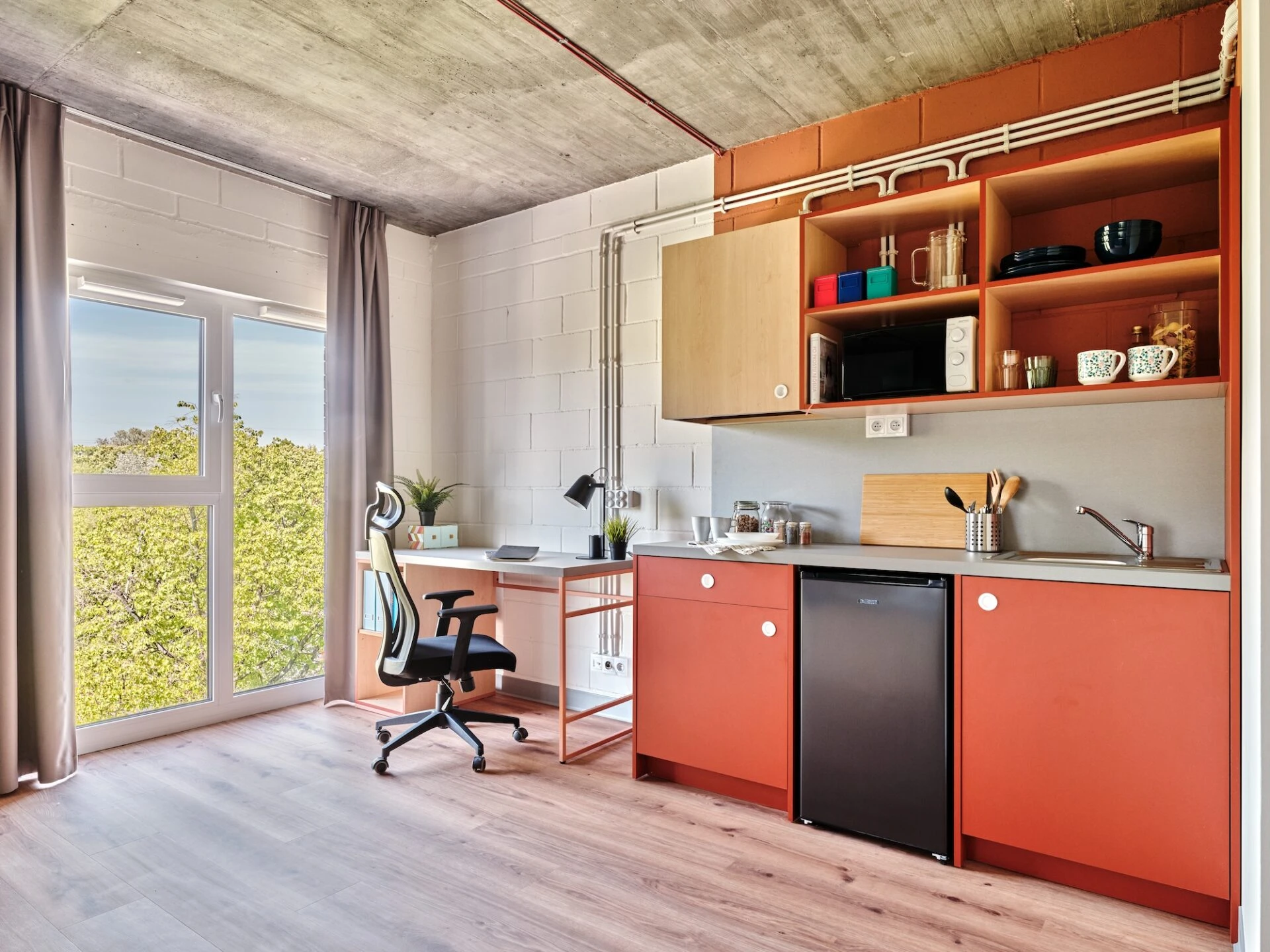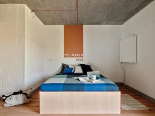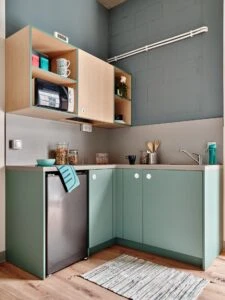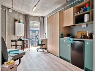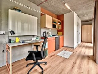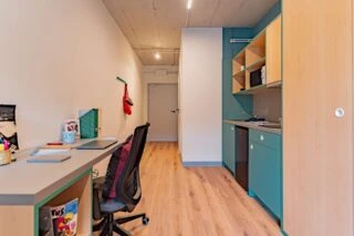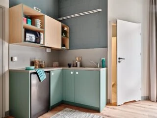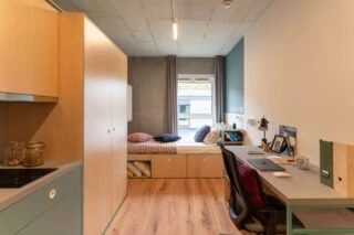Estos apartamentos están equipados con todo lo que necesitas para sentirte como en casa: cama de 120 cm, espacio de trabajo, mucho espacio de almacenamiento, baño privado y cocina equipada con nevera, microondas, fregadero y fogones.