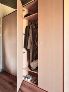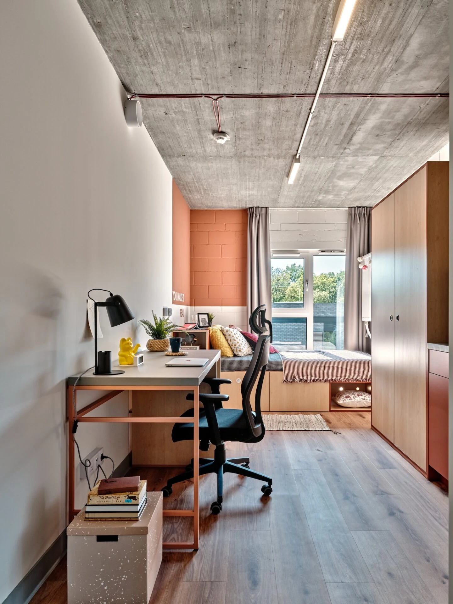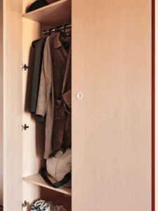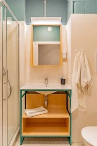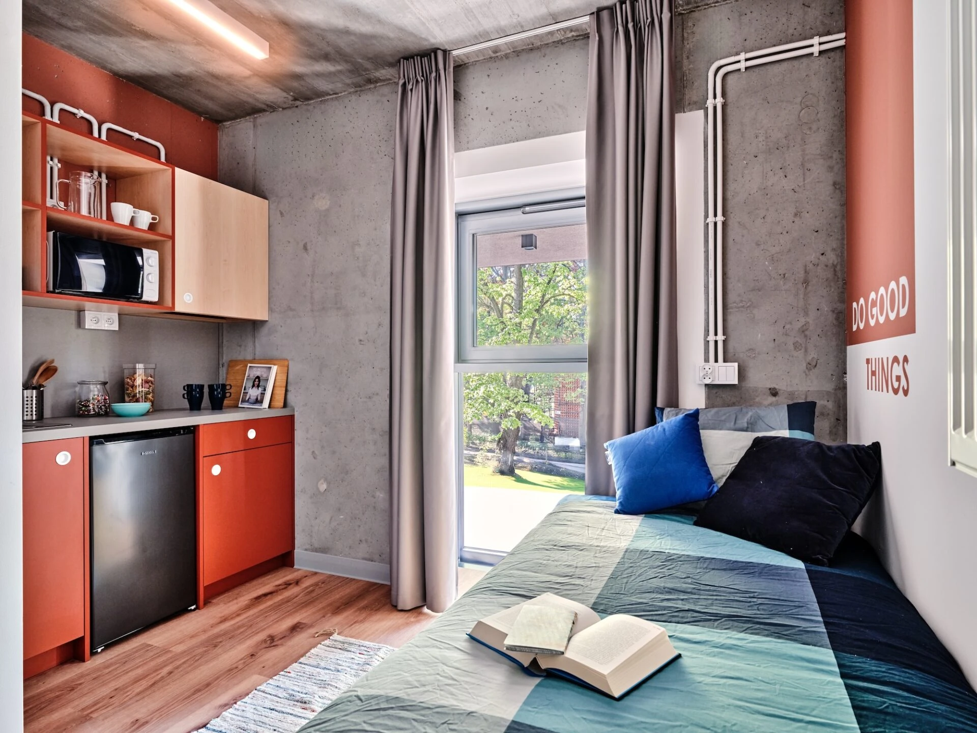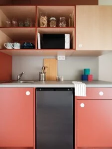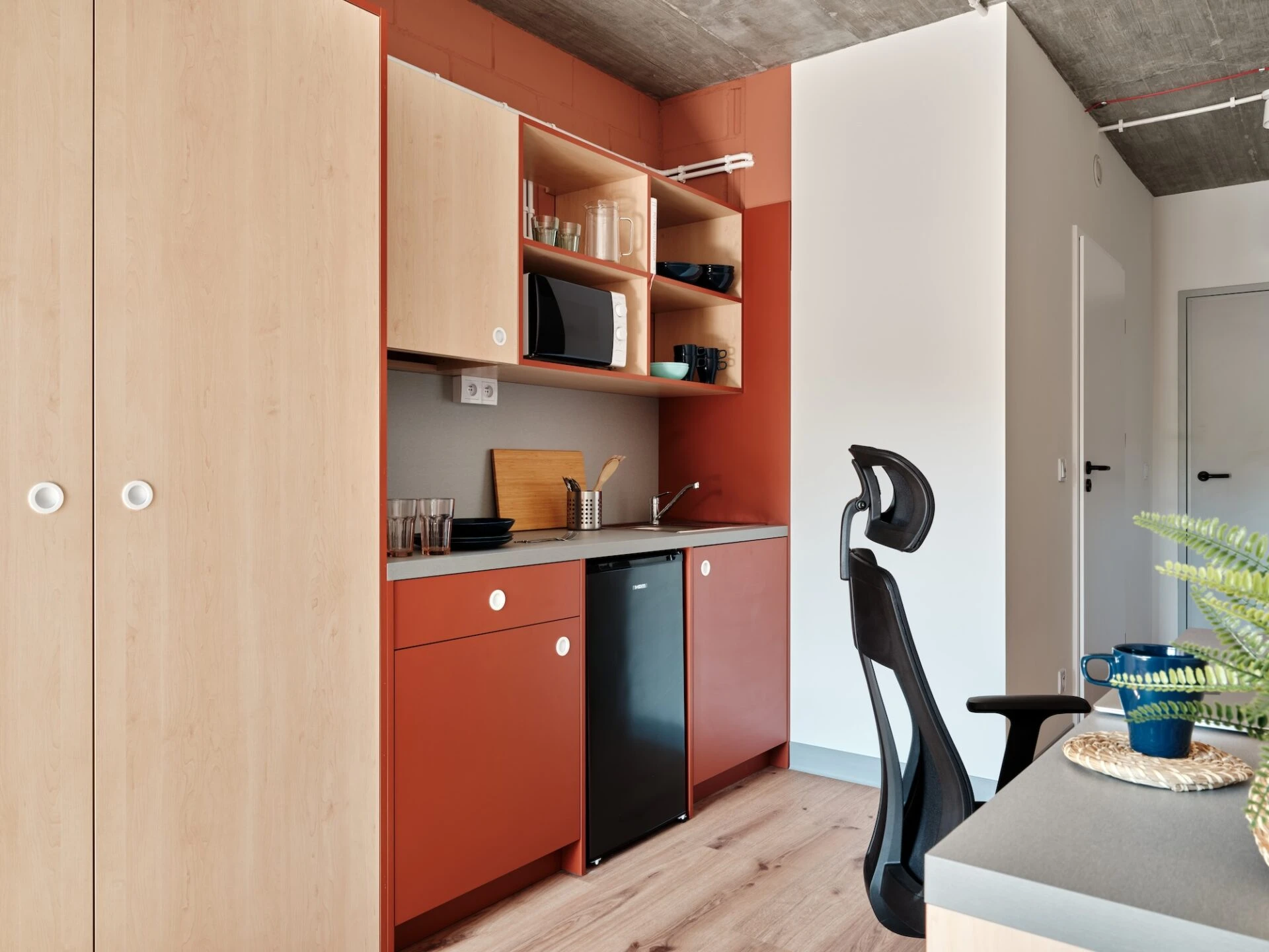 Estos apartamentos están equipados con todo lo que necesitas para sentirte como en casa: cama de 120 cm, espacio de trabajo, mucho espacio de almacenamiento, baño privado y cocina equipada con nevera, microondas, fregadero y fogones.