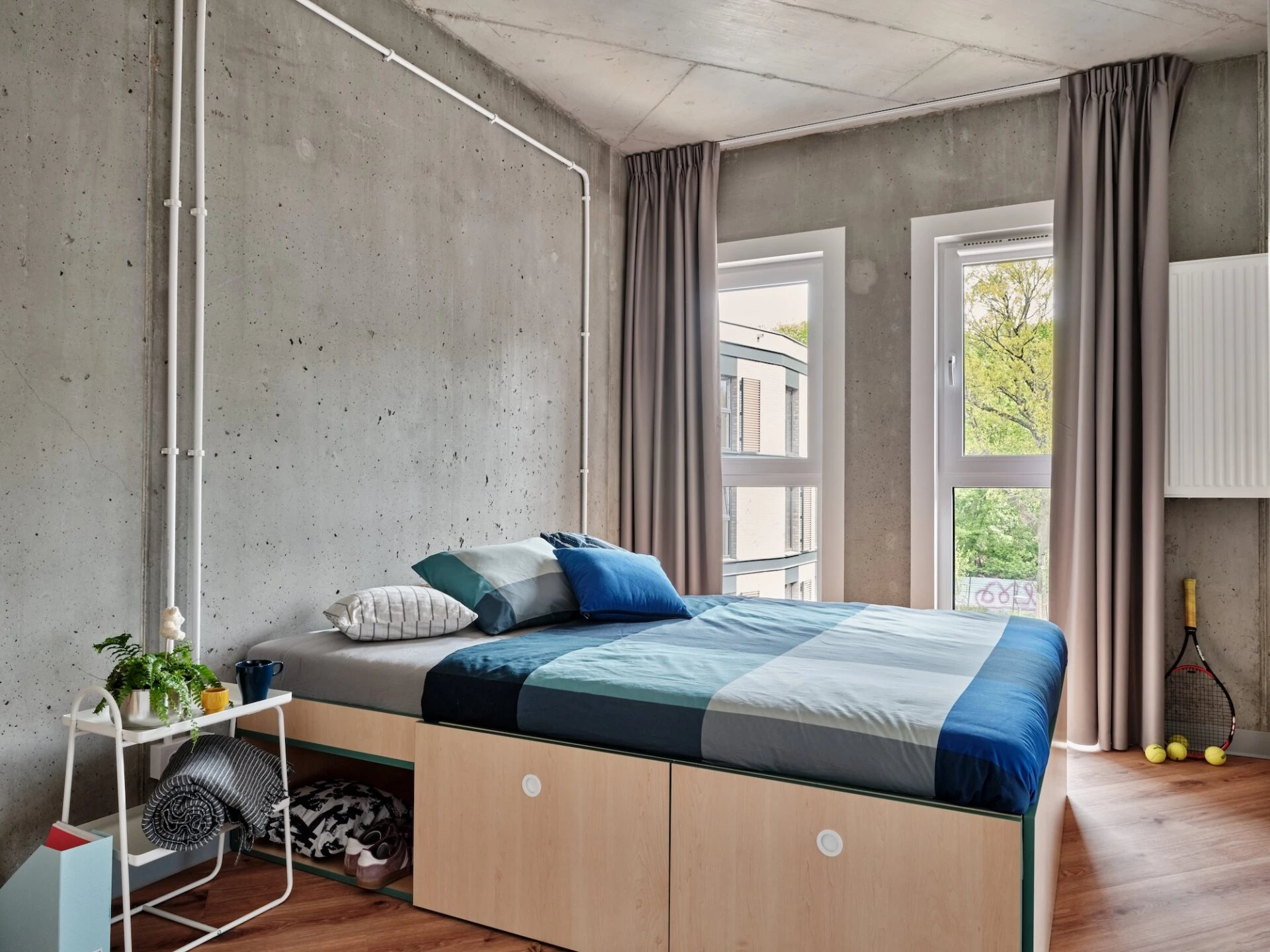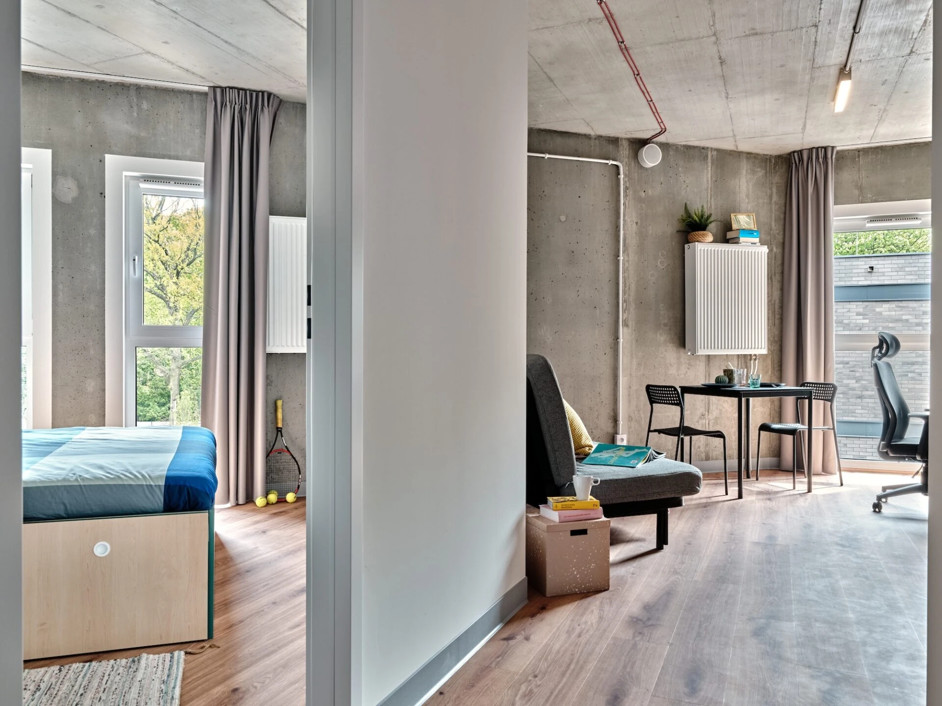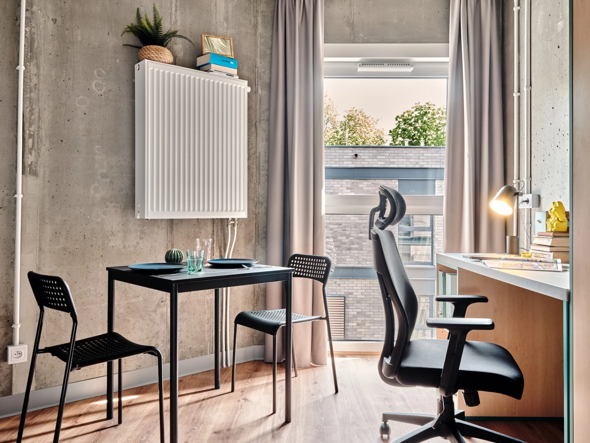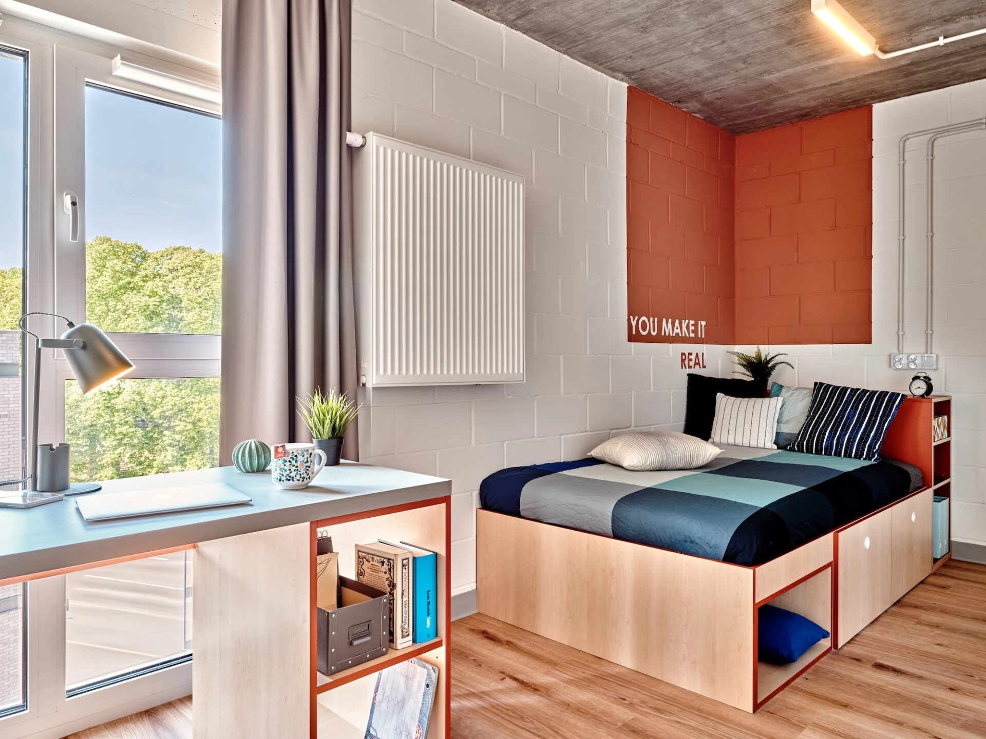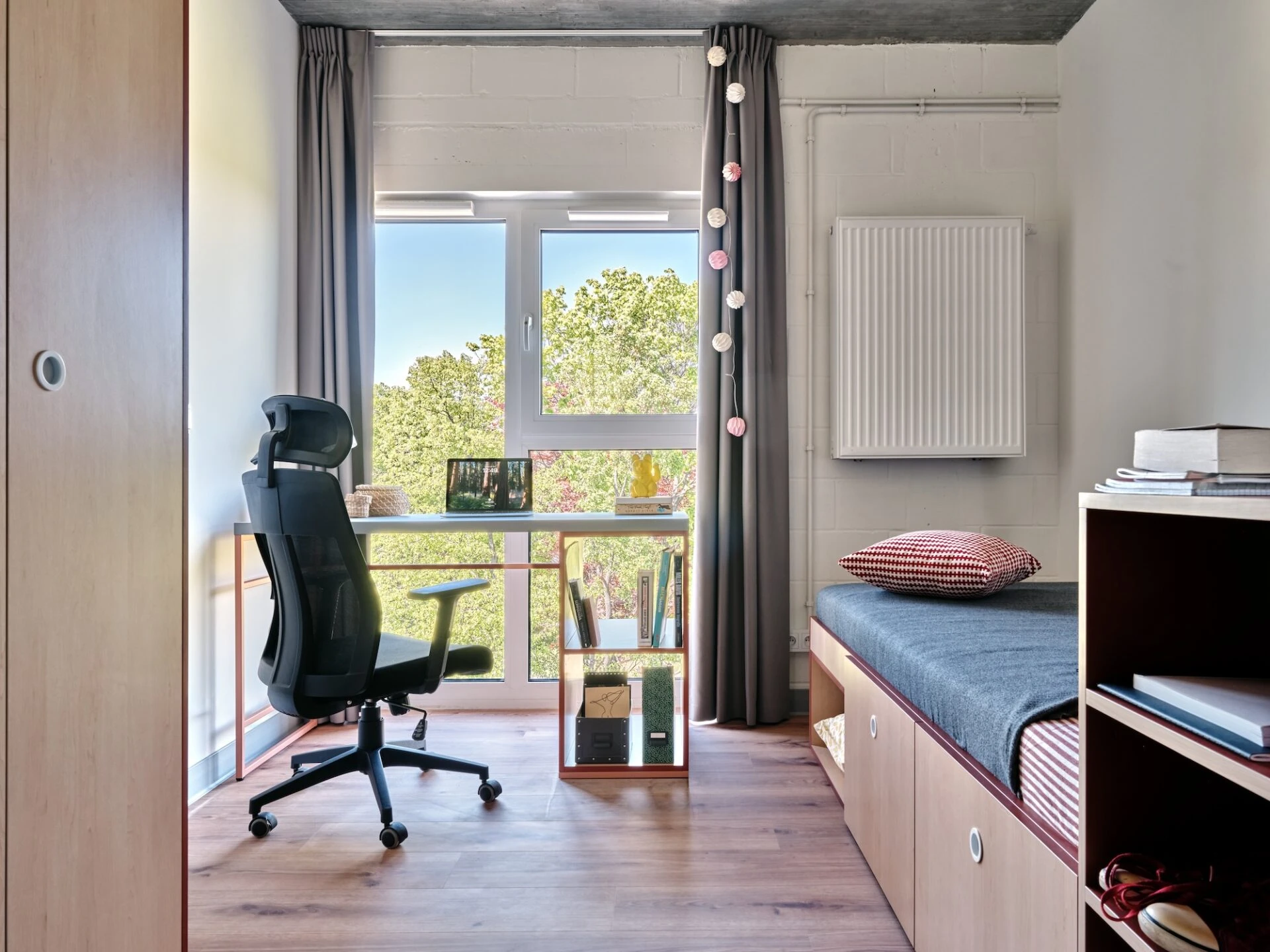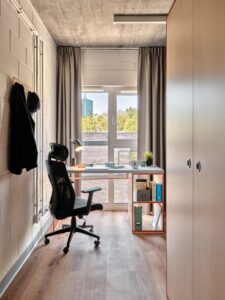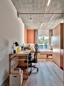 Estos apartamentos están equipados con todo lo que necesitas para sentirte como en casa: cama de 100 o 120 cm, espacio de trabajo, mucho espacio de almacenamiento, baño privado y cocina equipada con nevera, microondas, fregadero y fogones.