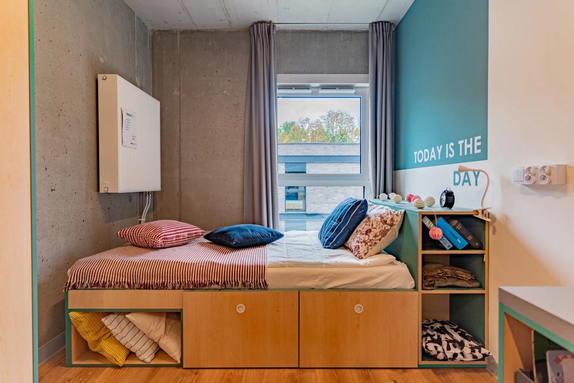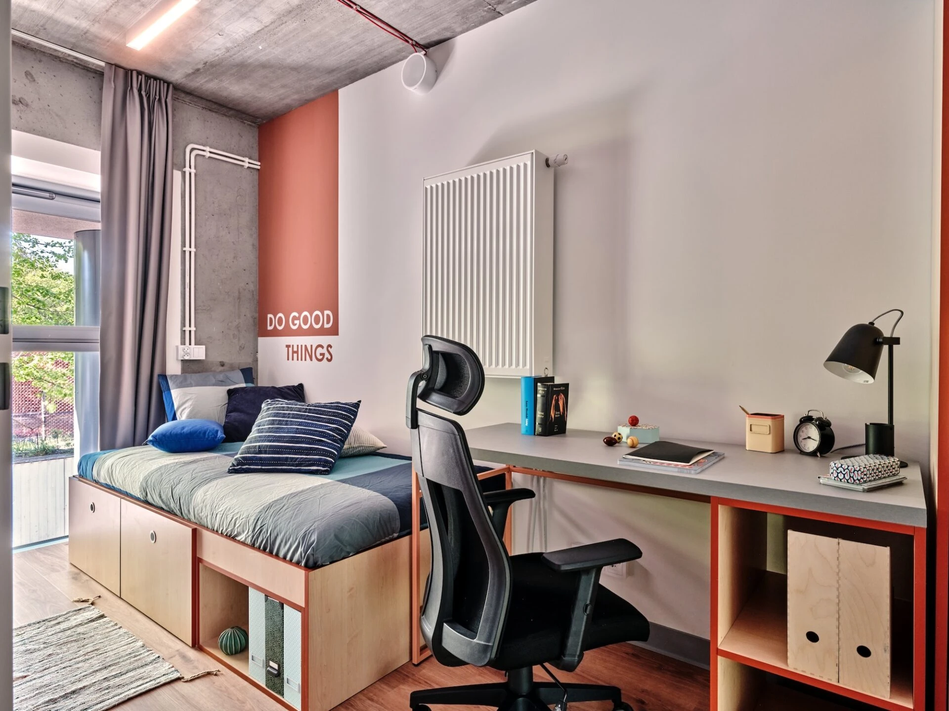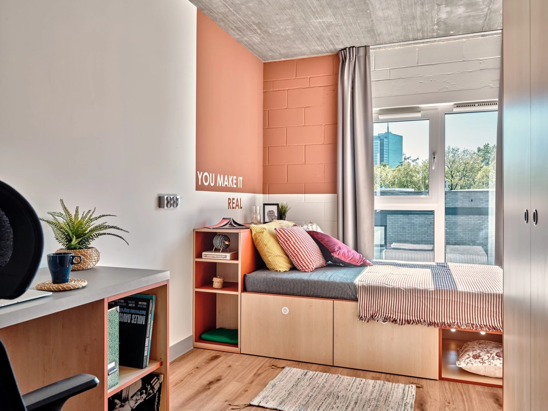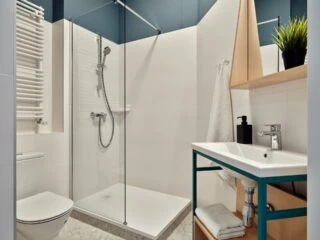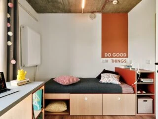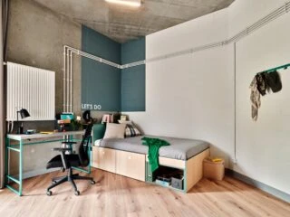 Estos apartamentos de nuestra residencia de estudiantes en Varsovia están equipados con todo lo que necesitas para sentirte como en casa, incluyendo una cama de 120 cm, un espacio de trabajo, un montón de almacenamiento, un cuarto de baño y cocina equipada con nevera, microondas, fregadero y vitrocerámica.
