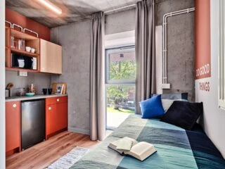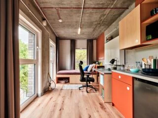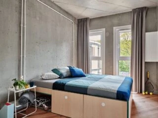Estos apartamentos son los más grandes de nuestras habitaciones individuales y están equipados con todo lo necesario para sentirse como en casa, incluyendo una cama de 120 cm, un espacio de trabajo, un montón de almacenamiento, un cuarto de baño y cocina equipada con nevera, microondas, fregadero y vitrocerámica.