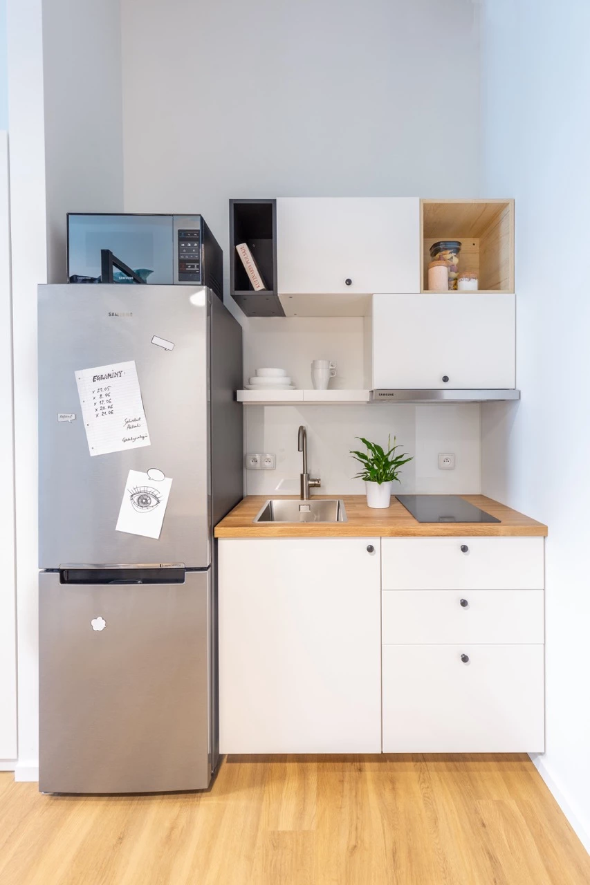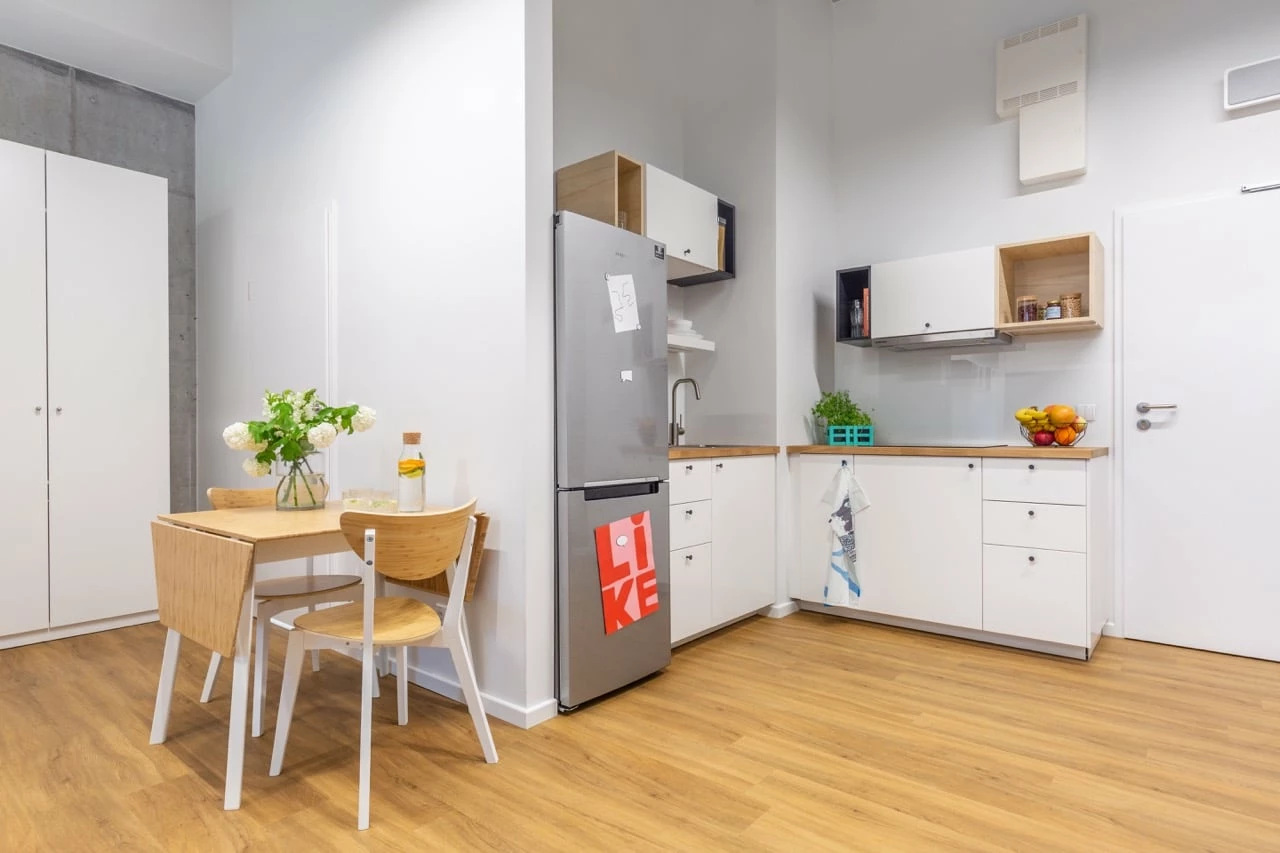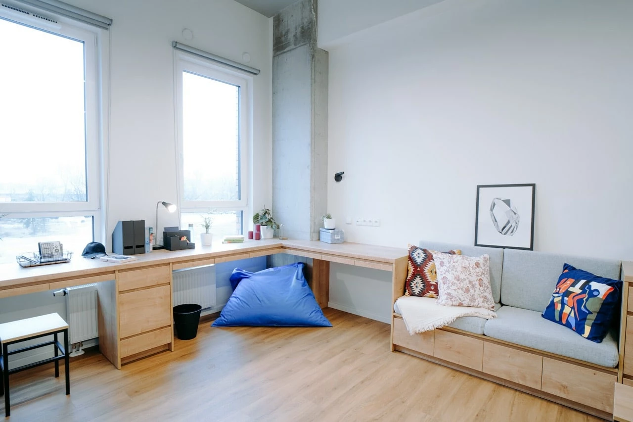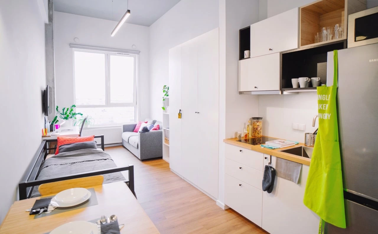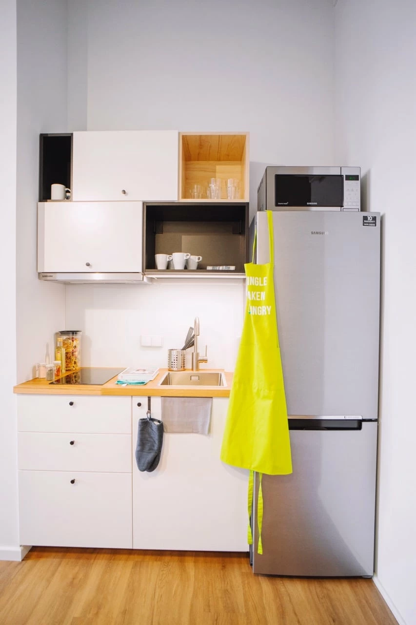 Apartamenty te są wyposażone we wszystko, czego potrzebujesz, aby poczuć się jak w domu, w tym w łóżko o szerokości 90 cm lub 160 cm, miejsce do pracy, mnóstwo miejsca do przechowywania, łazienkę i prywatną kuchnię wyposażoną w lodówkę, kuchenkę mikrofalową, zlew i płytę grzejną. Będziesz mieć pełny dostęp do wszystkich naszych wspólnych udogodnień, w tym WIFI, przestrzeni coworkingowych, siłowni, pralni, rowerowni i stref relaksu.