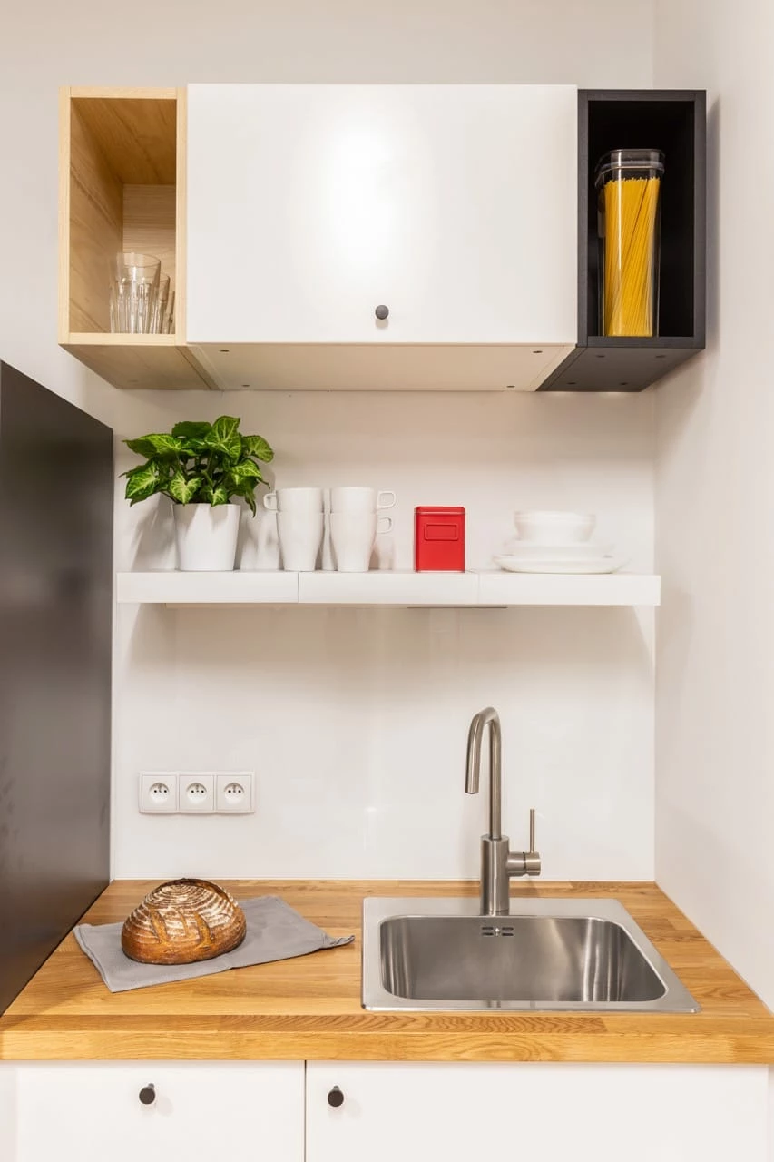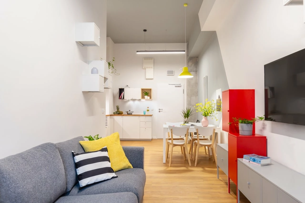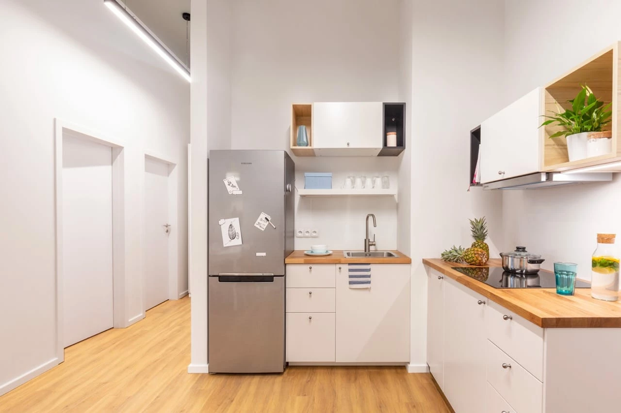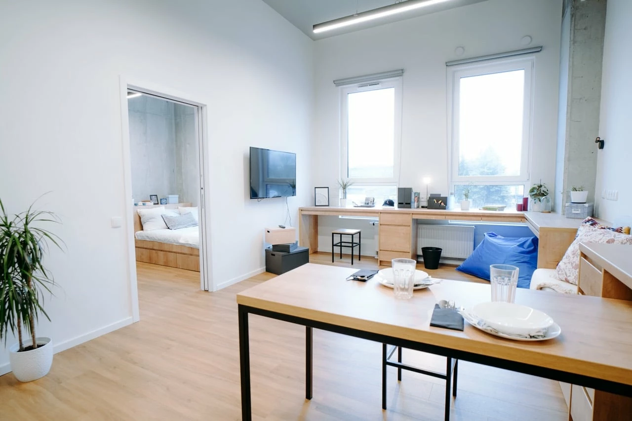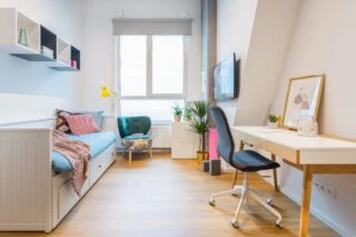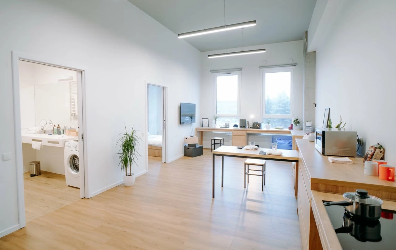 Apartamenty te są wyposażone we wszystko, czego potrzebujesz, aby poczuć się jak w domu, w tym w łóżko o szerokości 90 cm lub 160 cm, miejsce do pracy, mnóstwo miejsca do przechowywania, łazienkę i prywatną kuchnię wyposażoną w lodówkę, kuchenkę mikrofalową, zlew i płytę grzejną. Będziesz mieć pełny dostęp do wszystkich naszych wspólnych udogodnień, w tym WIFI, przestrzeni coworkingowych, siłowni, pralni, rowerowni i stref relaksu.