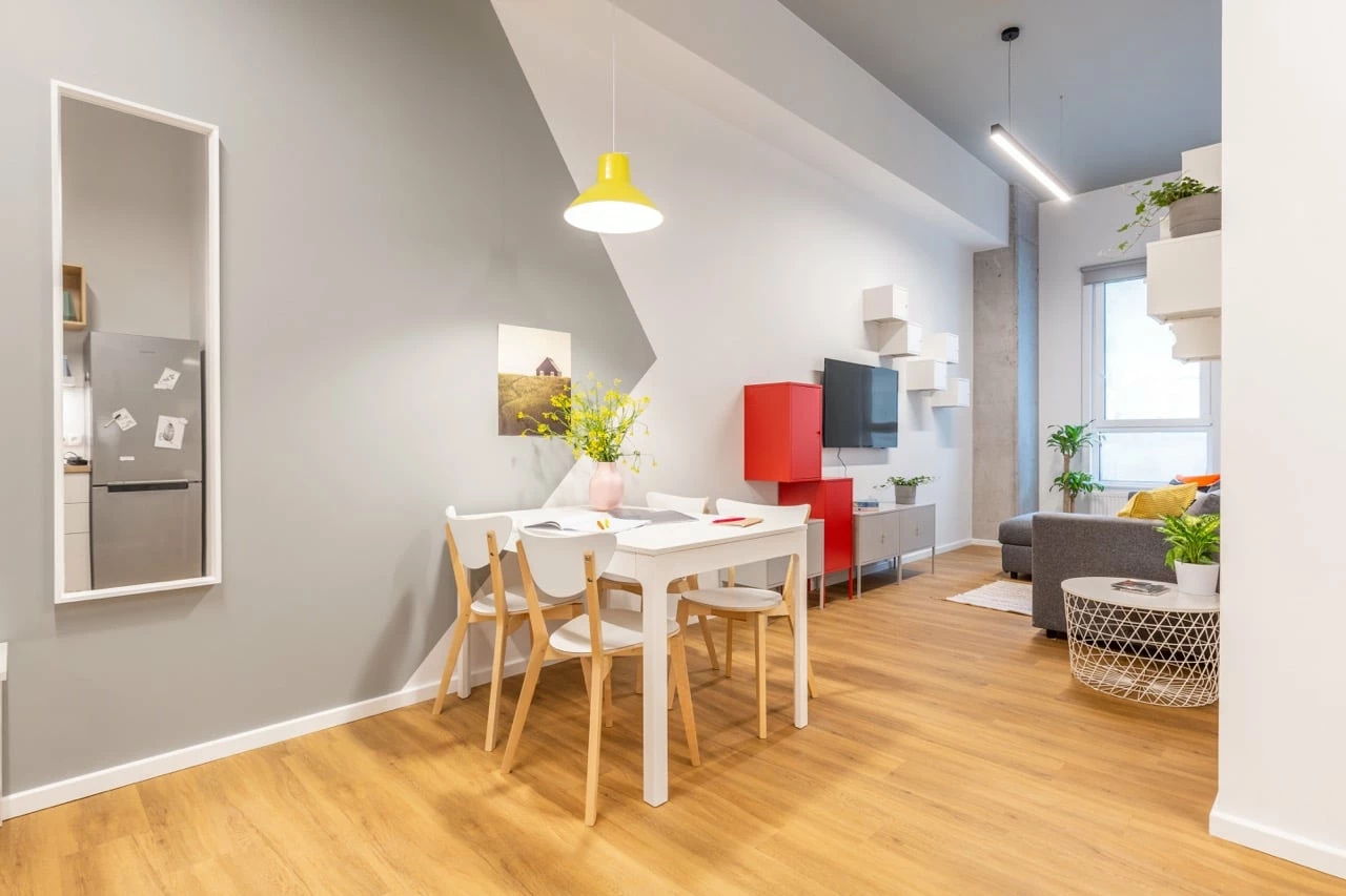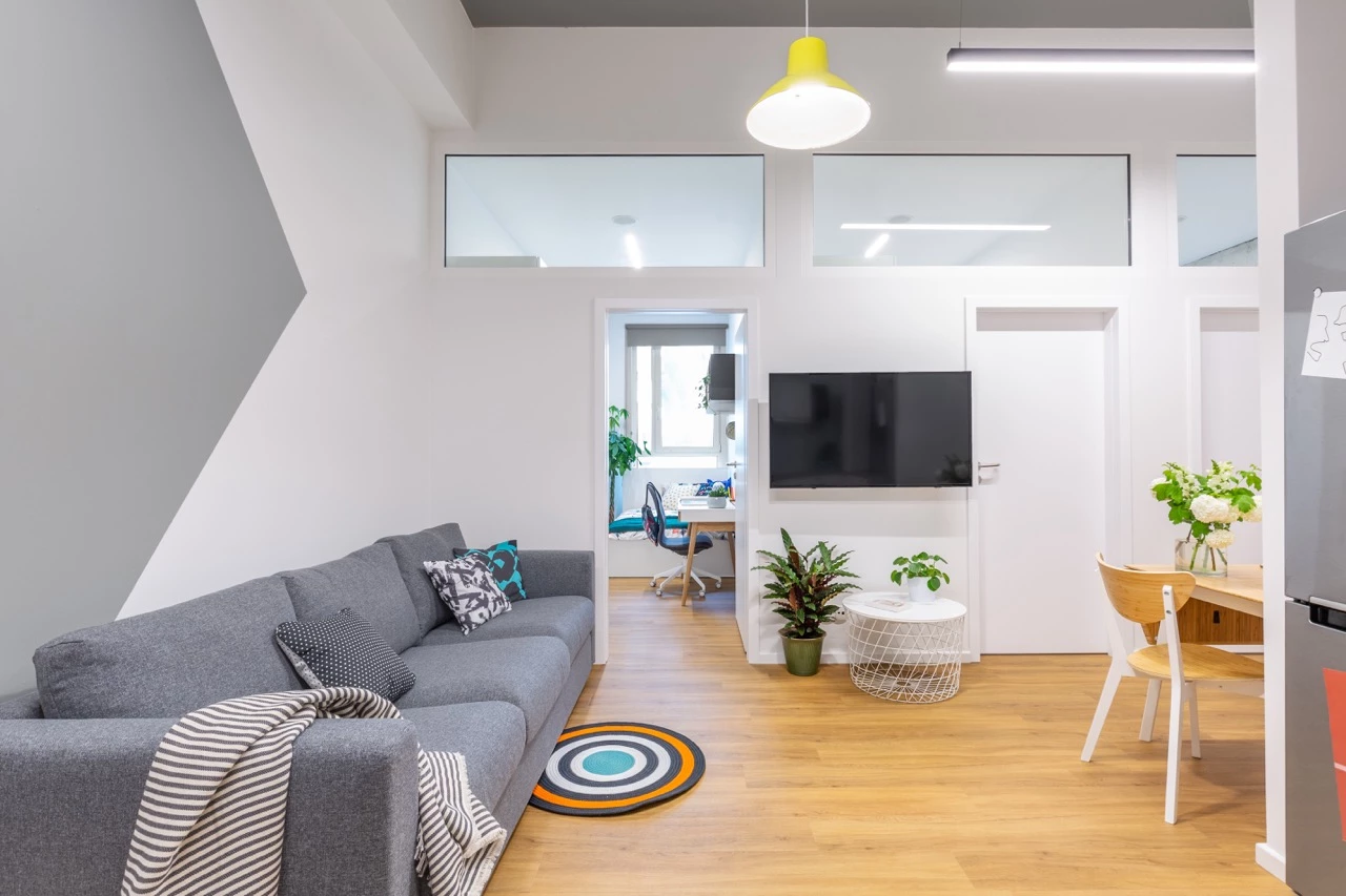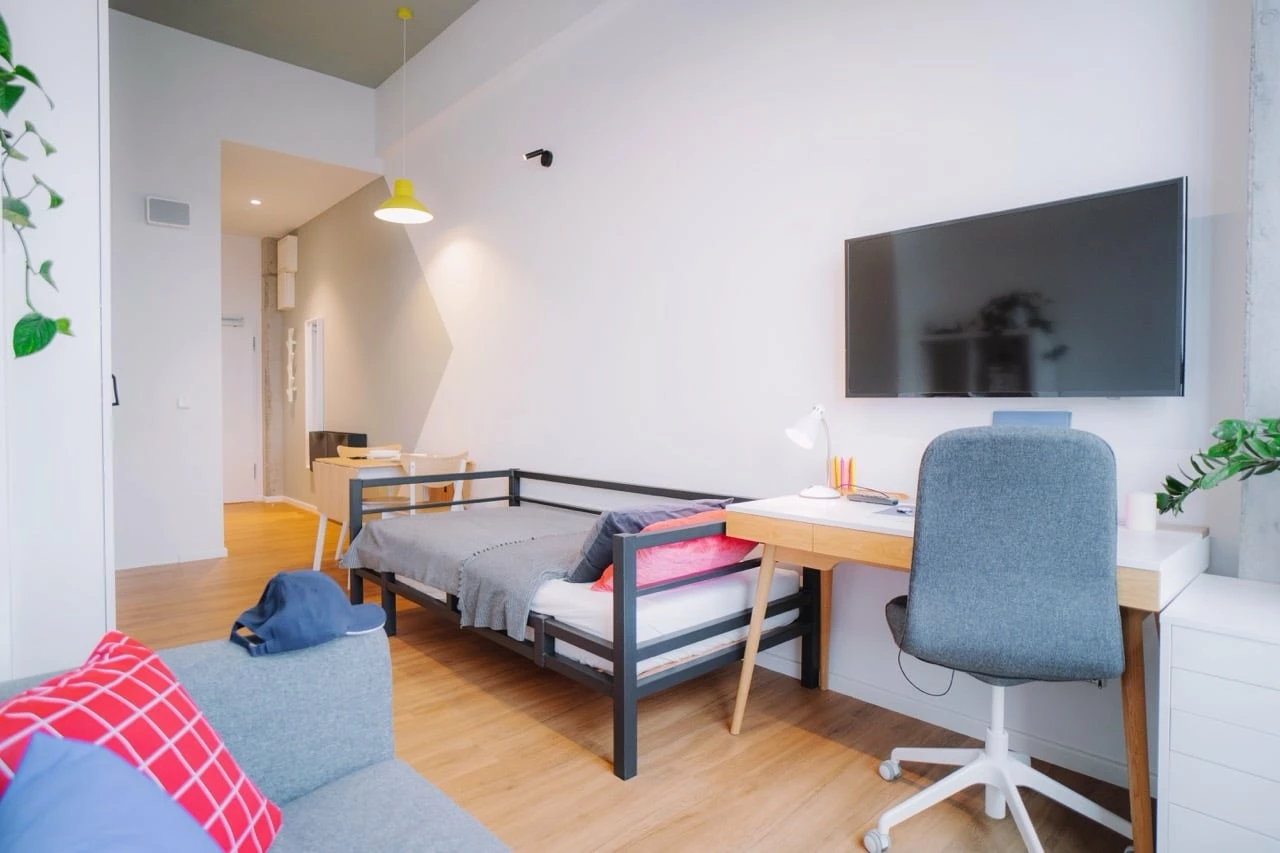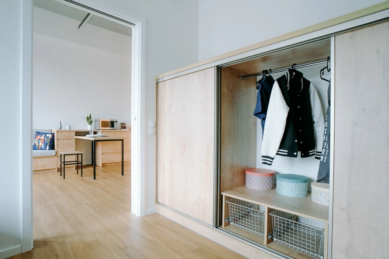 Apartamenty te są wyposażone we wszystko, czego potrzebujesz, aby poczuć się jak w domu, w tym w materac o szerokości 160 cm, który składa się do 80 cm, gdy go nie używasz, miejsce do pracy, mnóstwo miejsca do przechowywania i łazienkę. Będziesz mieć pełny dostęp do wszystkich naszych wspólnych udogodnień, w tym WIFI, kuchni, przestrzeni coworkingowych, siłowni, pralni, rowerowni i stref relaksu.