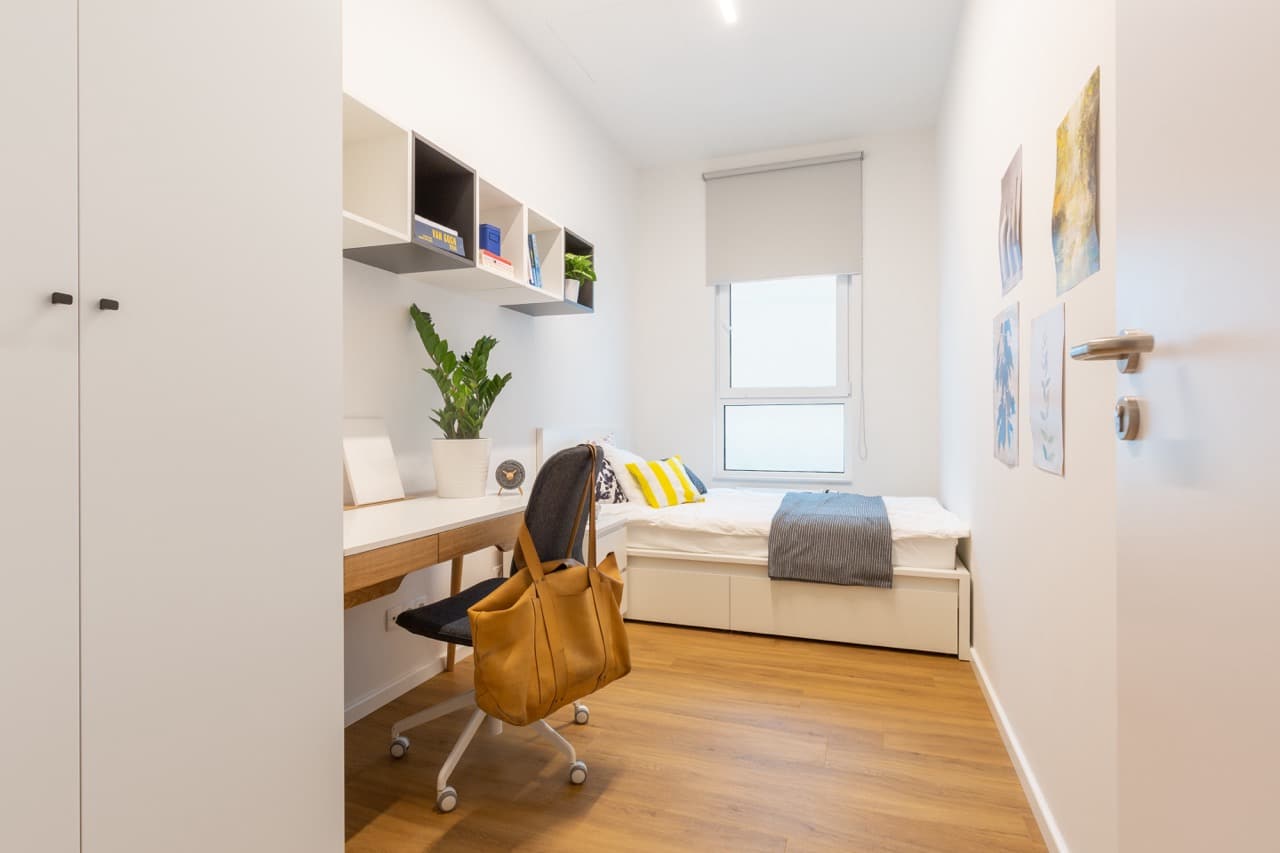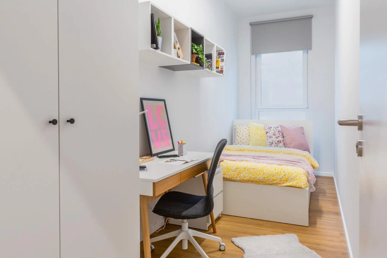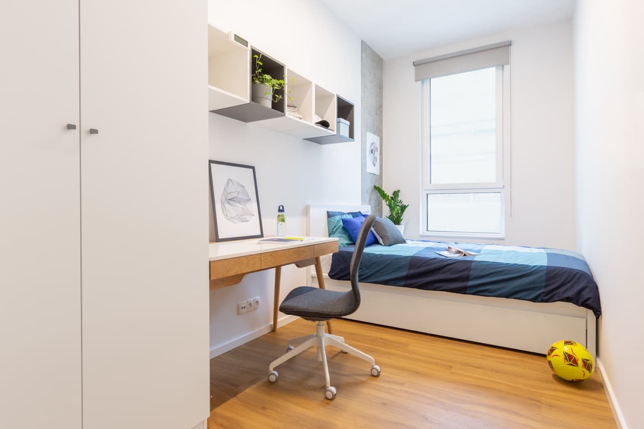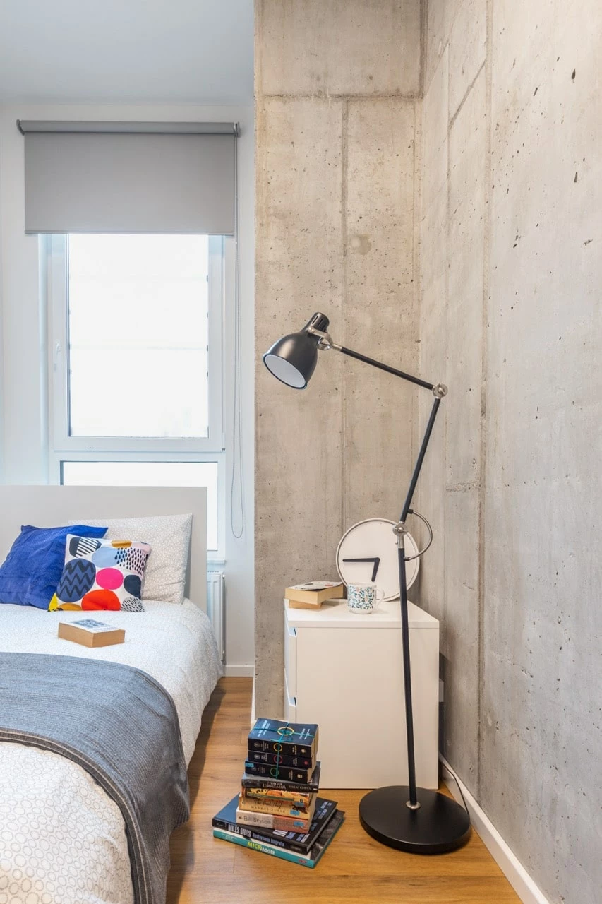 Prywatna sypialnia w apartamencie dla 3 osób. Apartamenty są wyposażone we wszystko, czego potrzebujesz, aby poczuć się jak w domu, w tym miejsca do pracy, dużo miejsca do przechowywania, łazienkę i kuchnię wyposażoną w lodówkę, kuchenkę mikrofalową, zlew i płytę grzejną. Będziesz mieć pełny dostęp do wszystkich naszych wspólnych udogodnień, w tym WIFI, kuchni, przestrzeni coworkingowych, siłowni, pralni, rowerowni i stref relaksu.
