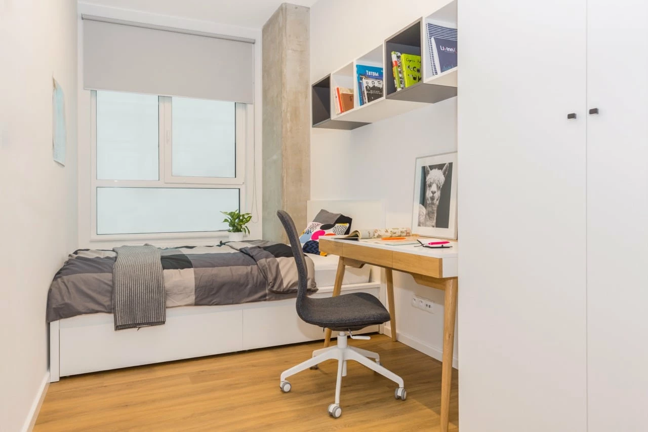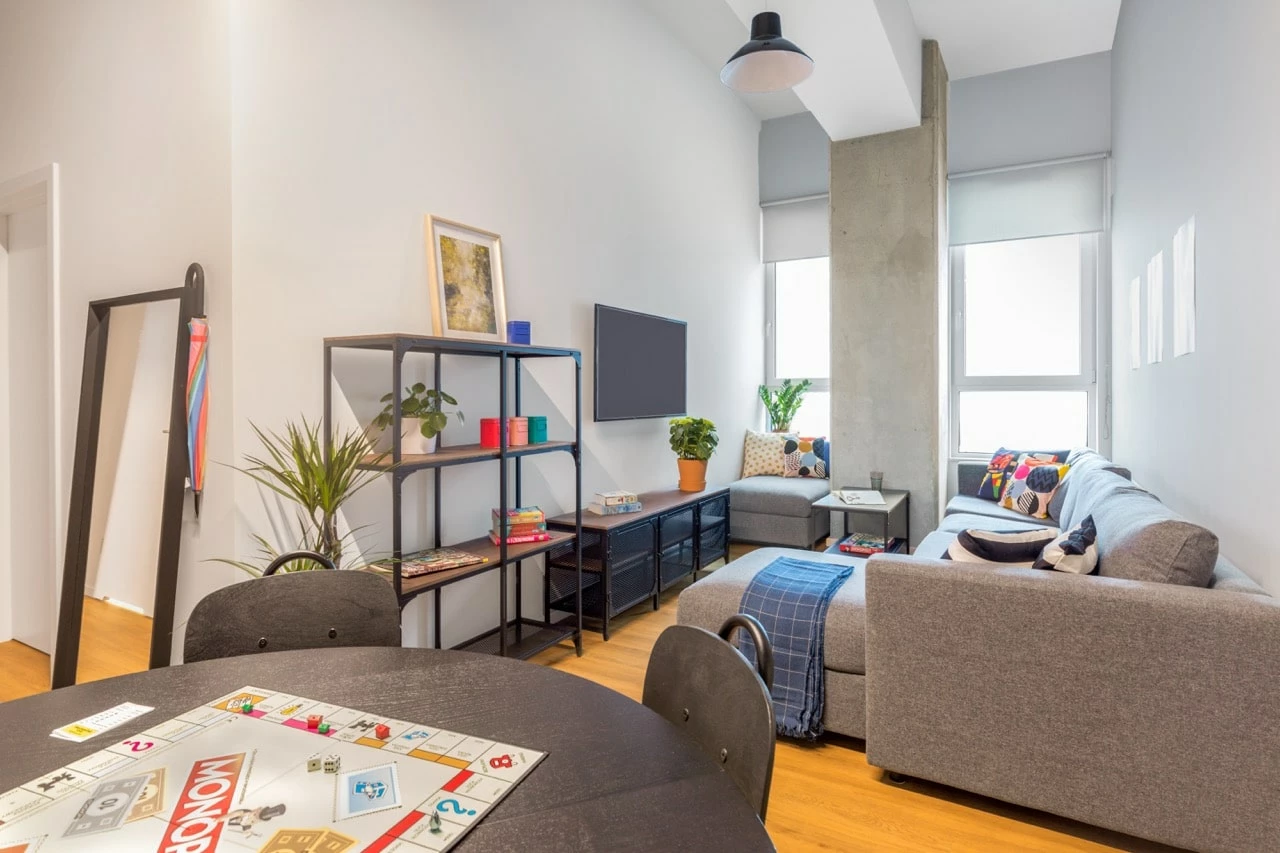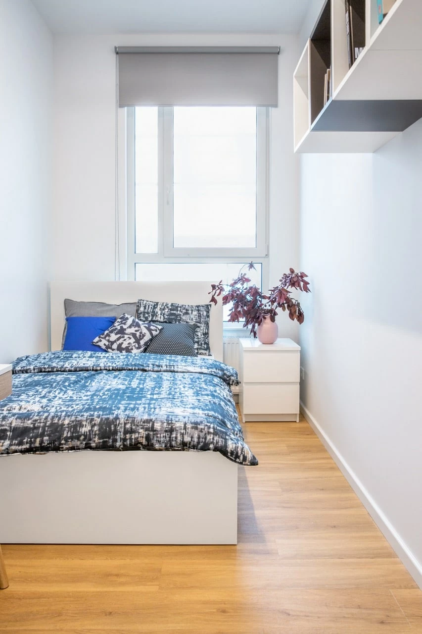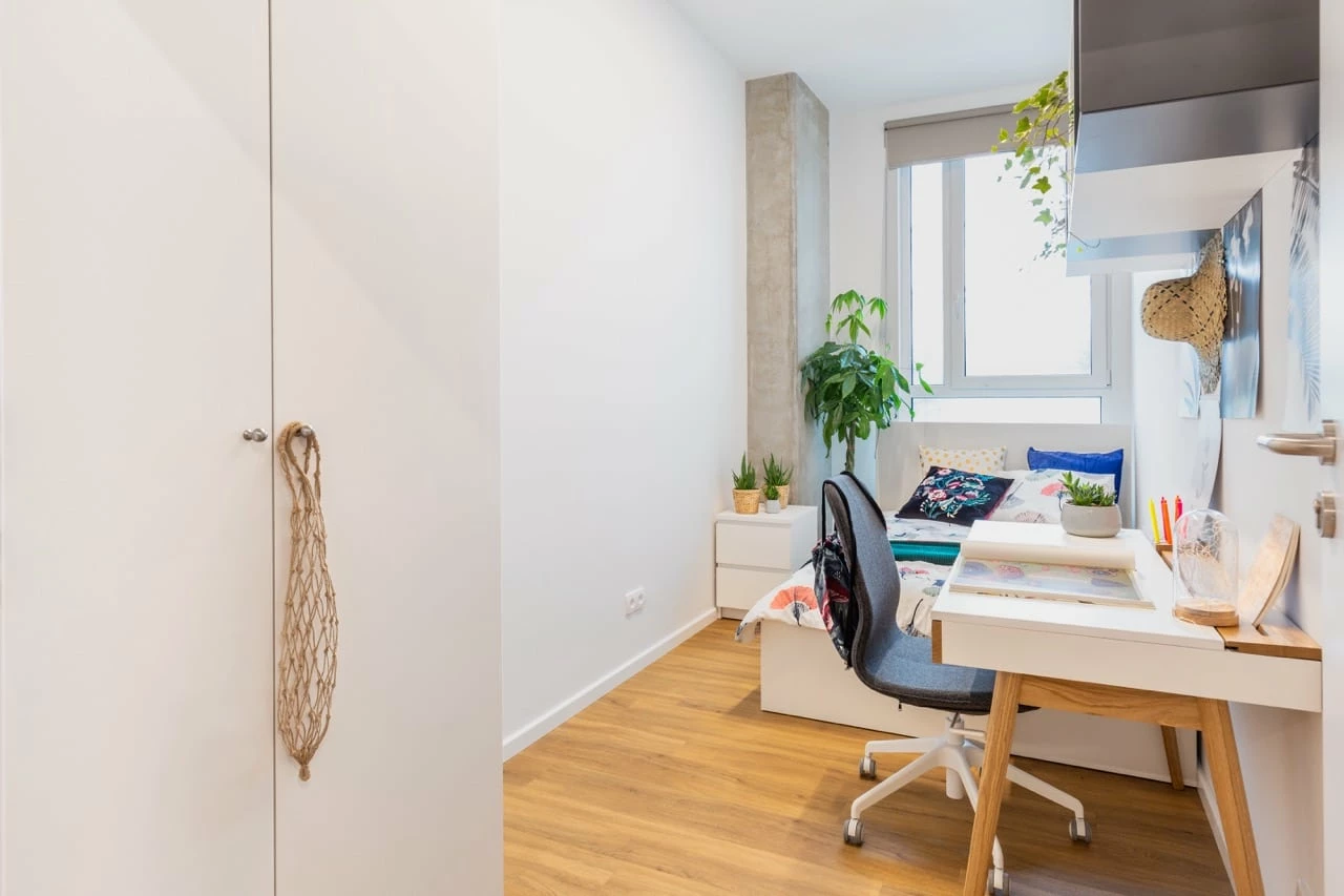 Prywatna sypialnia w apartamencie dla 3 osób. Apartamenty są wyposażone we wszystko, czego potrzebujesz, aby poczuć się jak w domu, w tym miejsca do pracy, dużo miejsca do przechowywania, łazienkę i kuchnię wyposażoną w lodówkę, kuchenkę mikrofalową, zlew i płytę grzejną. Będziesz mieć pełny dostęp do wszystkich naszych wspólnych udogodnień, w tym WIFI, kuchni, przestrzeni coworkingowych, siłowni, pralni, rowerowni i stref relaksu.