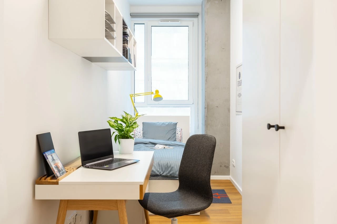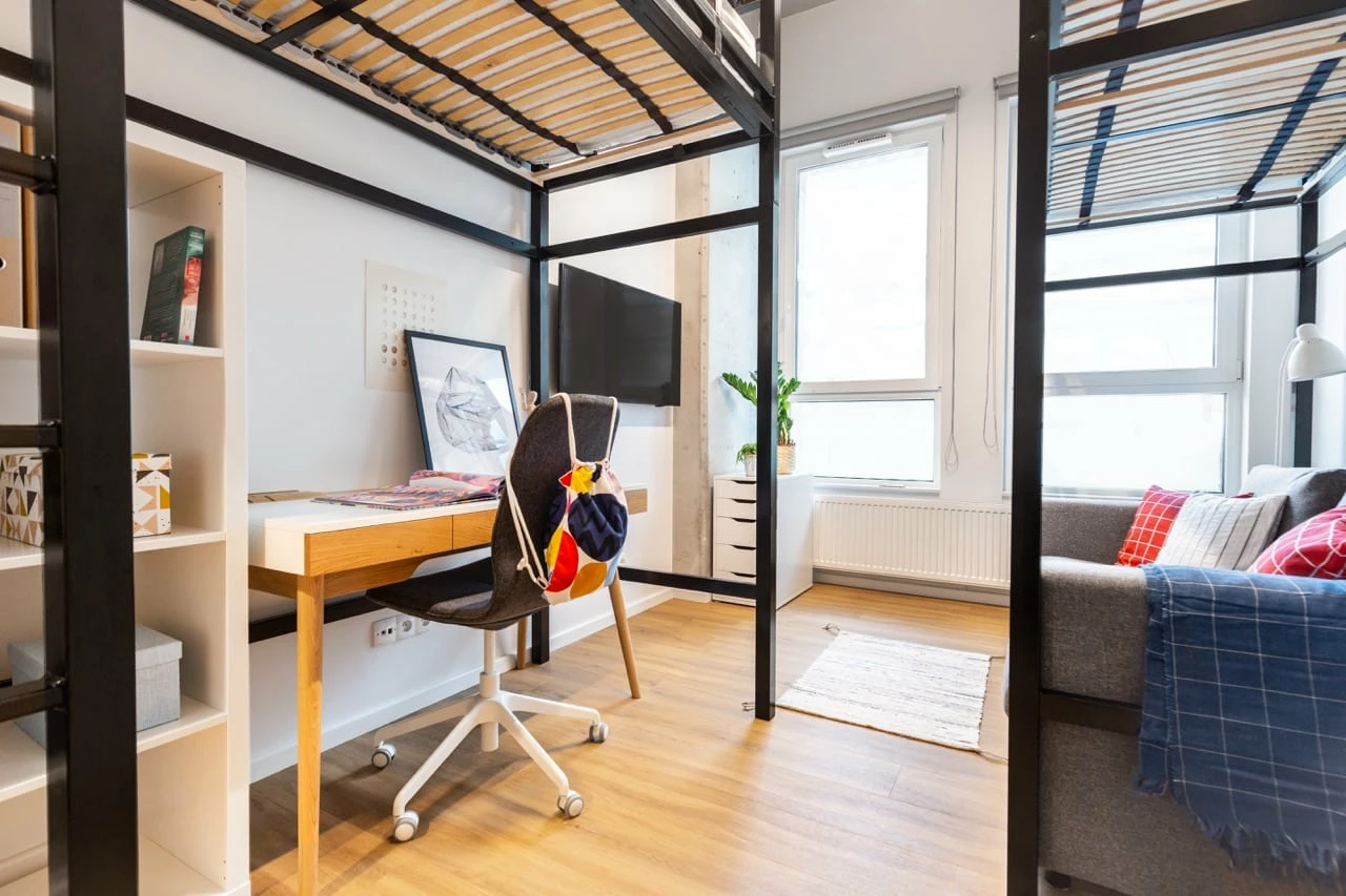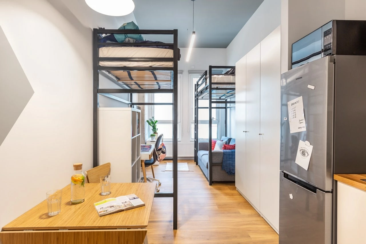 Te współdzielone apartamenty są wyposażone we wszystko, czego potrzebujesz, aby poczuć się jak w domu, w tym w dwa dwa łóżka na antresolach o szerokości 90 cm, miejsca do pracy, mnóstwo miejsca do przechowywania, łazienkę i kuchnię wyposażoną w lodówkę, kuchenkę mikrofalową, zlew i płytę grzejną. Będziesz mieć pełny dostęp do wszystkich naszych wspólnych udogodnień, w tym WIFI, kuchni, przestrzeni coworkingowych, siłowni, pralni, rowerowni i stref relaksu.